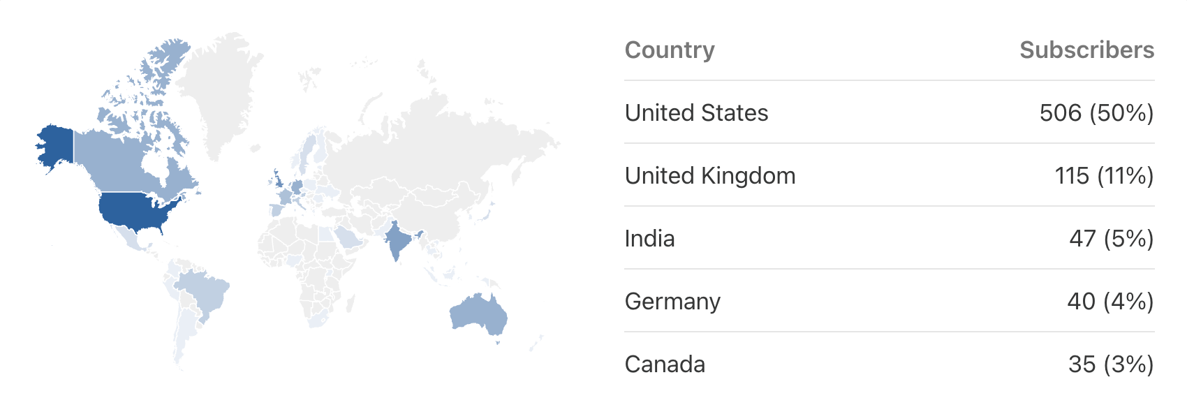 Half of my subscribers are from the US, and the other half from the rest of the world, with the UK, India, Germany, and Canada being the leading countries outside the US.1