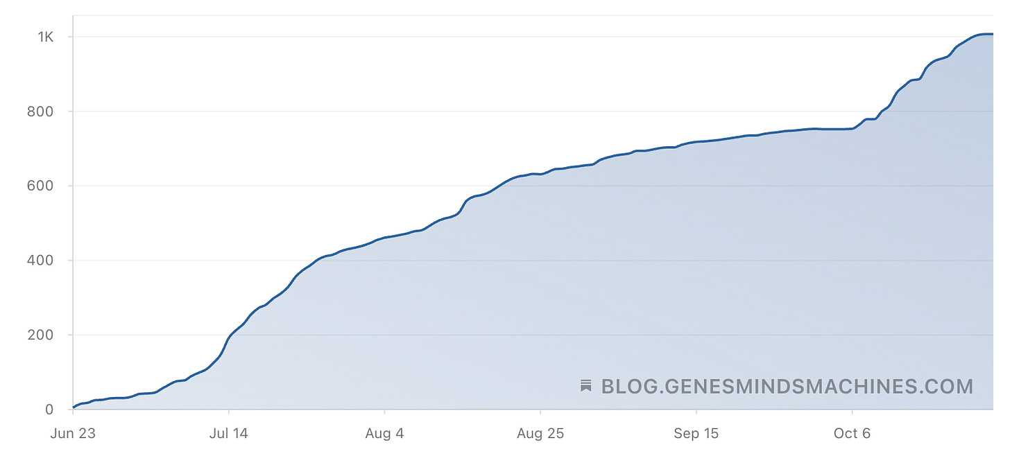 A few days ago I broke 1000 subscribers here on Substack. I’d like to thank everybody who has subscribed and who supports my writing. It took me four months to get to a thousand subscribers. (I posted my first article here on June 23, 2025.) At this rate, it will take only 333 years to reach a million. 😉