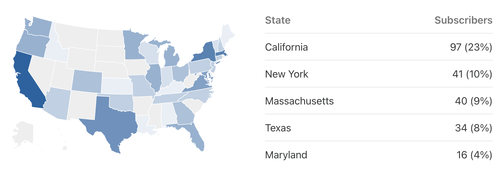 I was surprised to see Massachusetts and Maryland rank highly in subscriber numbers. They are only the 16th and 18th most populous states, respectively. I suspect subscriber numbers in these states are driven by the large number of people working in higher ed and/or biological research.