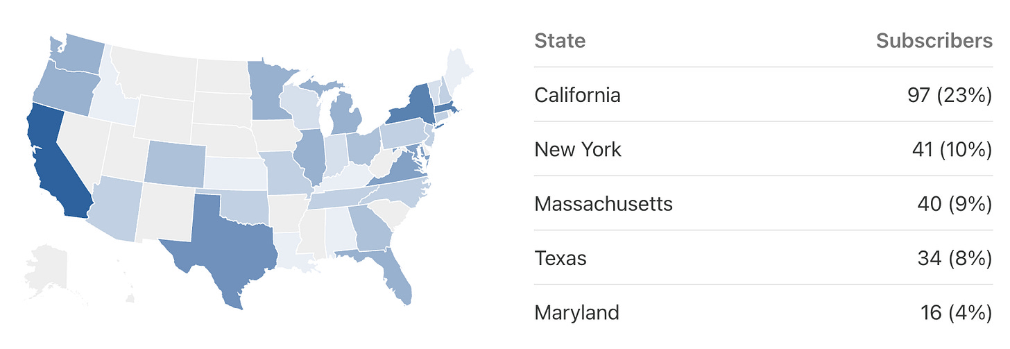 As of today, I have ten subscribers in Florida. There are at least eleven states with more than ten subscribers, in alphabetical order: California, Illinois, Maryland, Massachusetts, Michigan, Minnesota, New York, Oregon, Texas, Virginia, Washington.