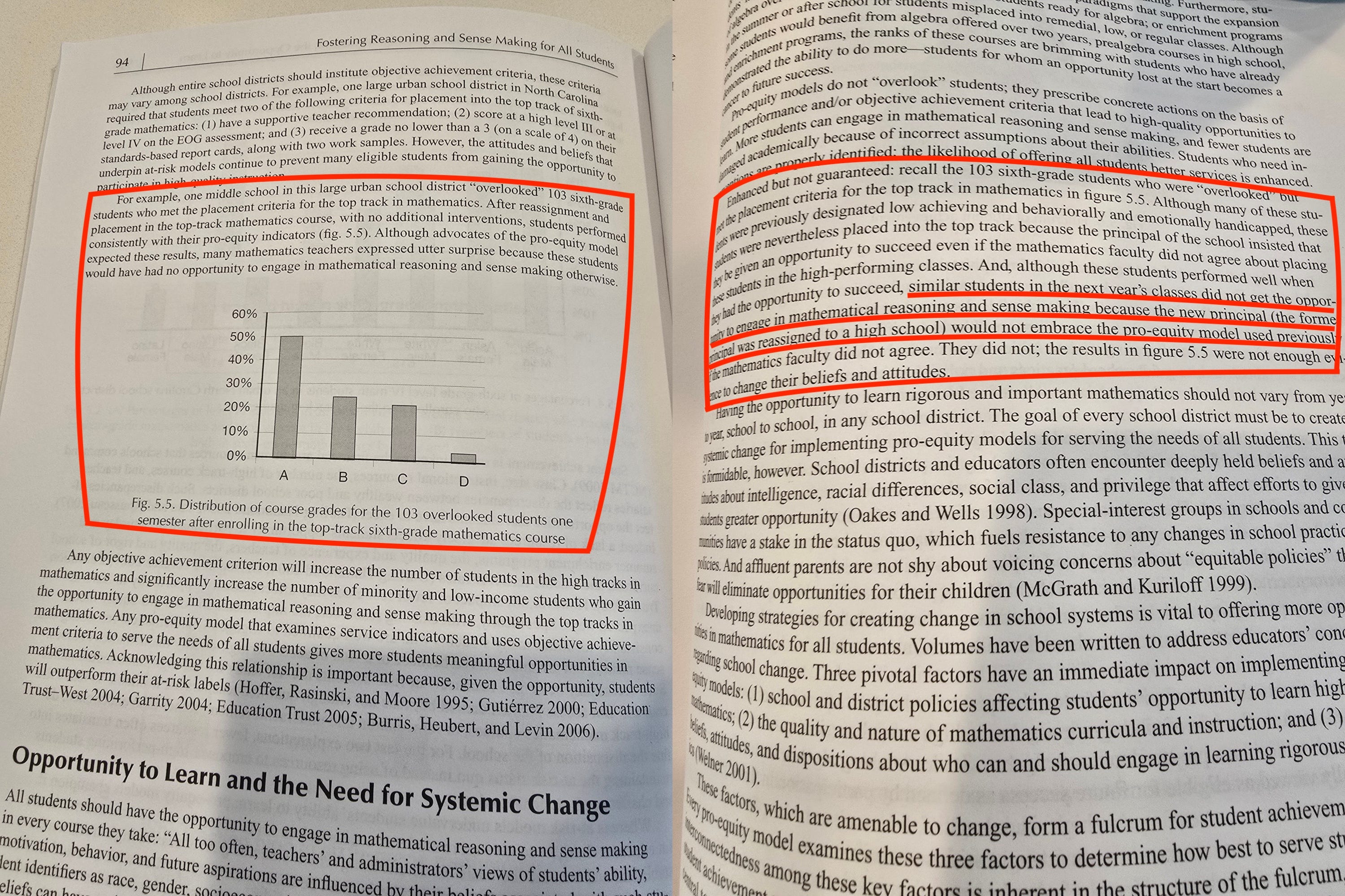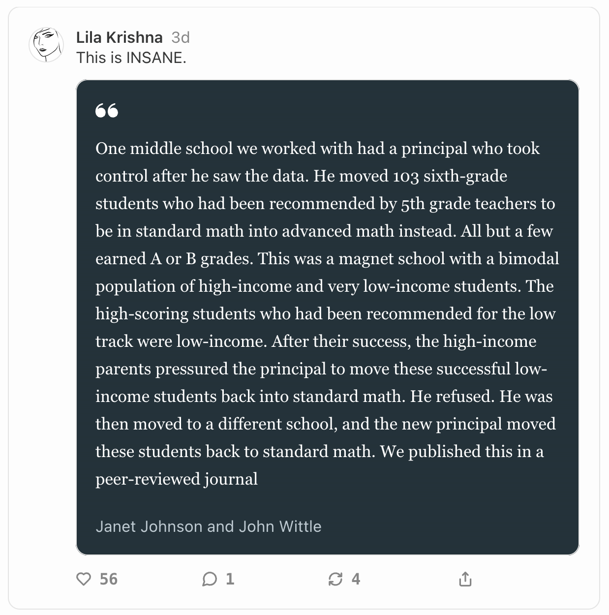 But before we go into what I found, let’s first review the details of the claim that got us here. The context is a Substack post about how low-income students are frequently deprived of the ability to take advanced math classes, even if they are scoring well in math. In this post, we can find the following story, which admittedly is pretty insane: