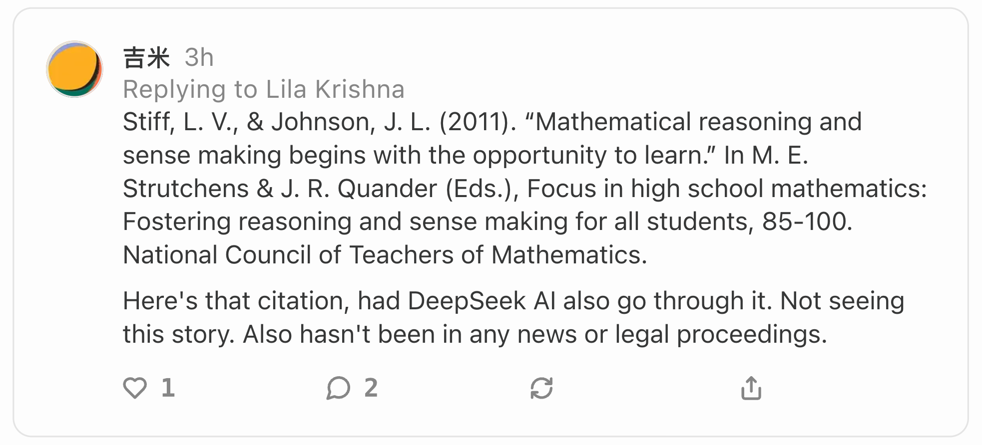 The second experience is more disconcerting, as it involves a person claiming that because DeepSeek AI couldn’t find a particular story it didn’t exist. The discussion was about whether a particular story about placement of high school students in advanced math classes had ever been published. The person wrote the following: