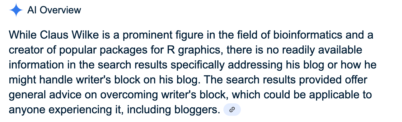 I had two experiences this past week where I saw how misleading it can be to take AI at face value. First, I was looking for an old blog post on writer’s block I had written. I did a simple Google search, “clauswilke blog writer’s block,” and the Google AI returned the following: