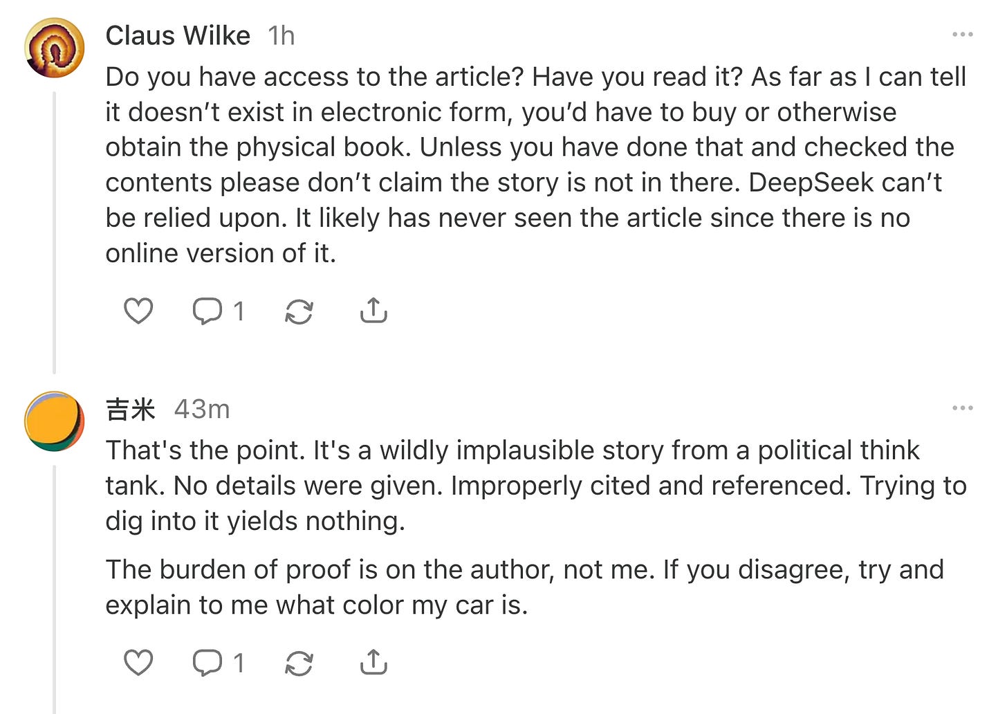 First, as far as I can tell, the article doesn’t exist in online form anywhere. I did a thorough search, and I’m pretty good at finding things online. At a minimum, it’s not easily accessible. So unless somebody actually has the physical book they are unlikely to have read the article. And second, DeepSeek AI is unlikely to have seen the article in its training data, again because it’s not easily available. Therefore, we can reasonably assume that neither the person nor DeepSeek AI had ever seen the article and therefore had no basis on which to make any claims regarding its content. In fact, when I pressed the person on whether they had read the article they confirmed they hadn’t: