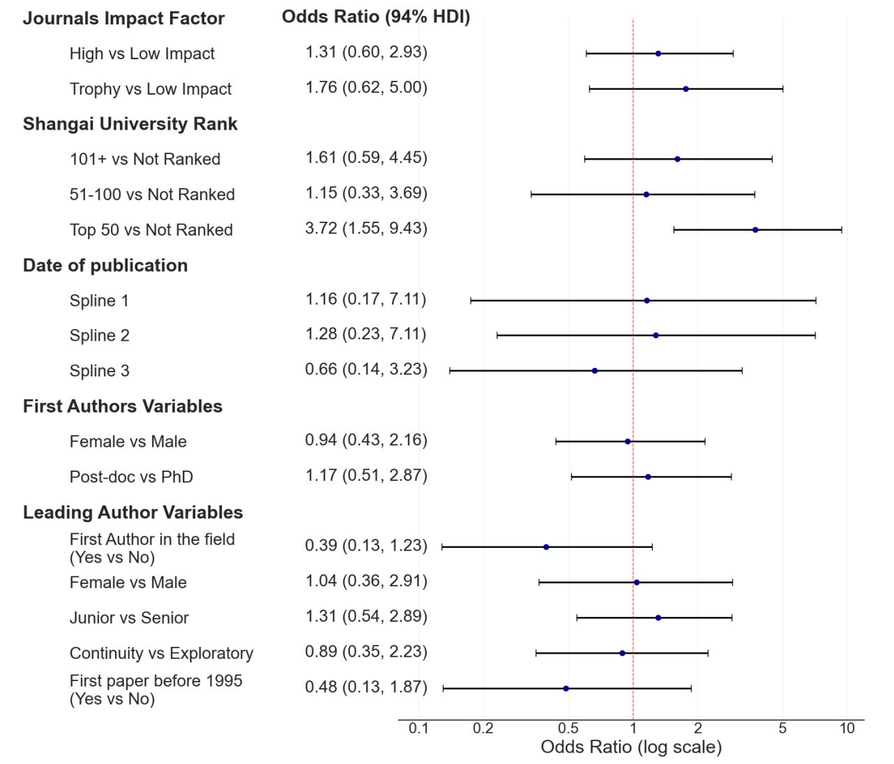 One could be tempted to interpret this as implying that higher ranked universities produce lower quality work, but I think this is a simplistic perspective that is not supported by the analysis. Remember that many more claims are unchallenged than challenged. For a claim to end up challenged, somebody needs to care enough that they redo the experiment. It is likely that work from the higher-ranked universities is more commonly subjected to subsequent verification, and therefore ends up more commonly on the list of successfully challenged works.1 This is where we return to the idea that many scientists are highly motivated to disprove their most famous peers.