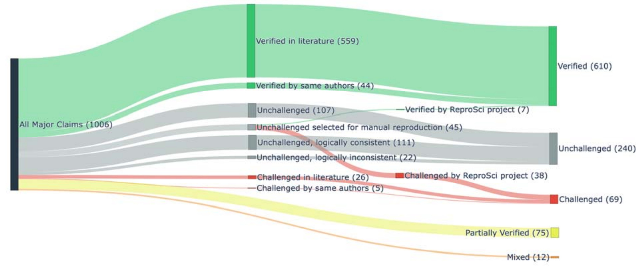 It is noteworthy that the majority of the challenged claims came from the additional experimental effort by this project, which chose 45 unchallenged claims, experimentally tested them, and found that 38 could not be verified. (Compare this to only 31 claims that had been challenged in the existing literature.) We might be tempted to interpret this finding as implying that most of the remaining unchallenged claims would likely fail verification if they were subjected to it. However, I am a bit wary of this conclusion. We don’t know how claims were chosen for additional experimental testing. Did they choose claims they thought were particularly unlikely to verify, or alternatively those they thought would hold up, or did they choose at random? An expert in the field would certainly be able to assess the likelihood that a given claim could or could not be verified. In fact, the authors identify subsets of unchallenged claims that are either consistent (“unchallenged, logically consistent”) or at odds (“unchallenged, logically inconsistent”) with other known facts in the field. I would expect that the latter category of claims is more likely to fail verification. I don’t think this was systematically studied.