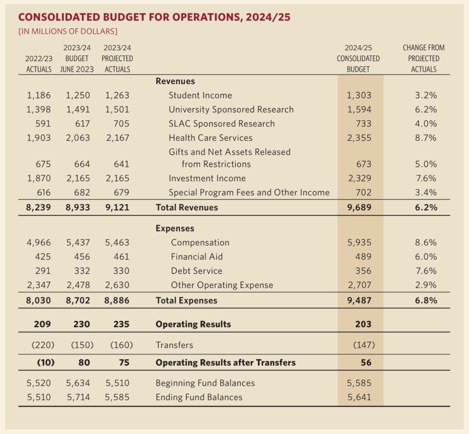 The Stanford budget is particularly large, but other universities have similar budgets. My employer, The University of Texas at Austin, has an annual budget of nearly $4 billion. For many universities, budget documents are public, and you can dive in and figure out exactly where moneys are coming from and where they are going. Finally, if you want an absolute deep dive into the depths of university finances, check out this book on the budget of a major biomedical research institution.